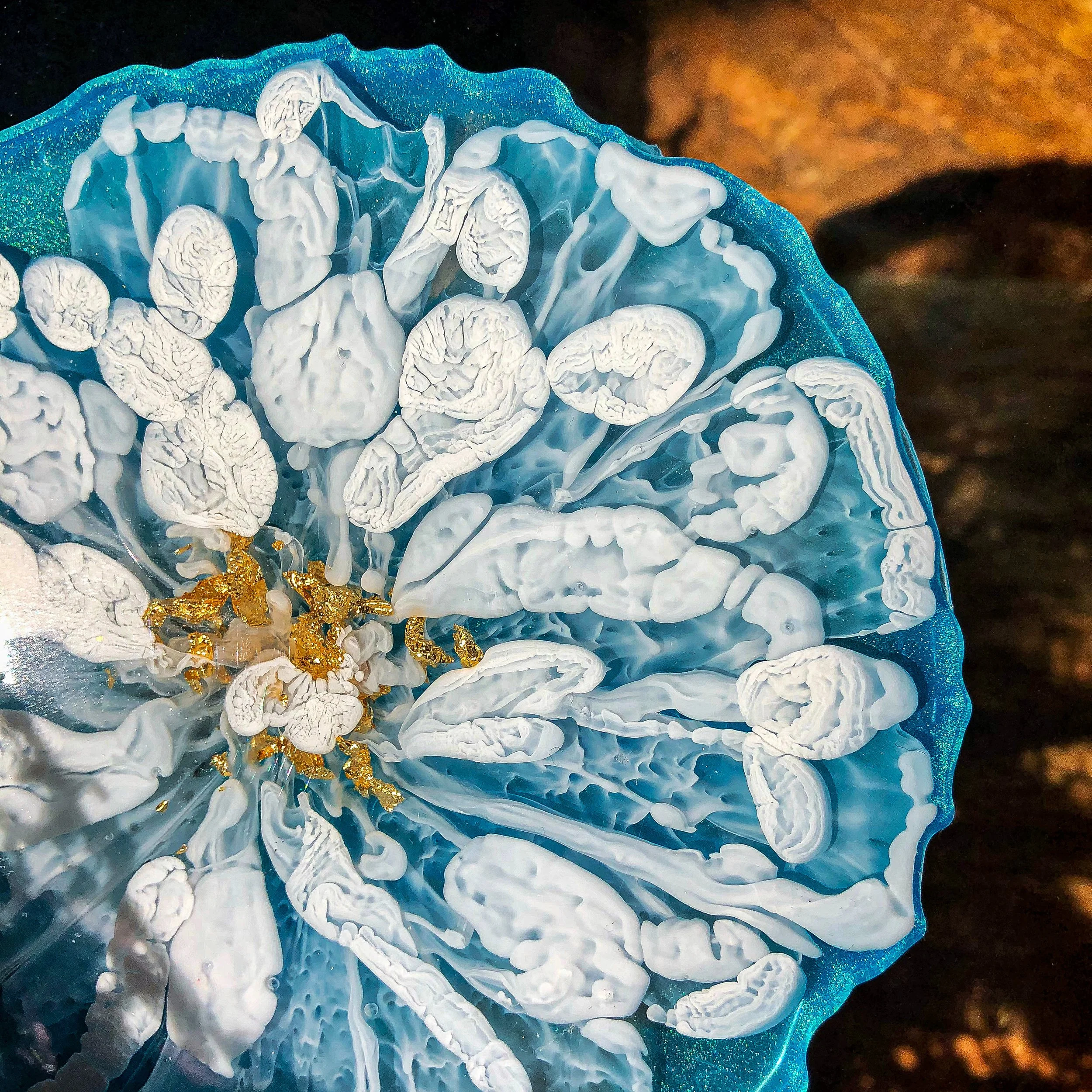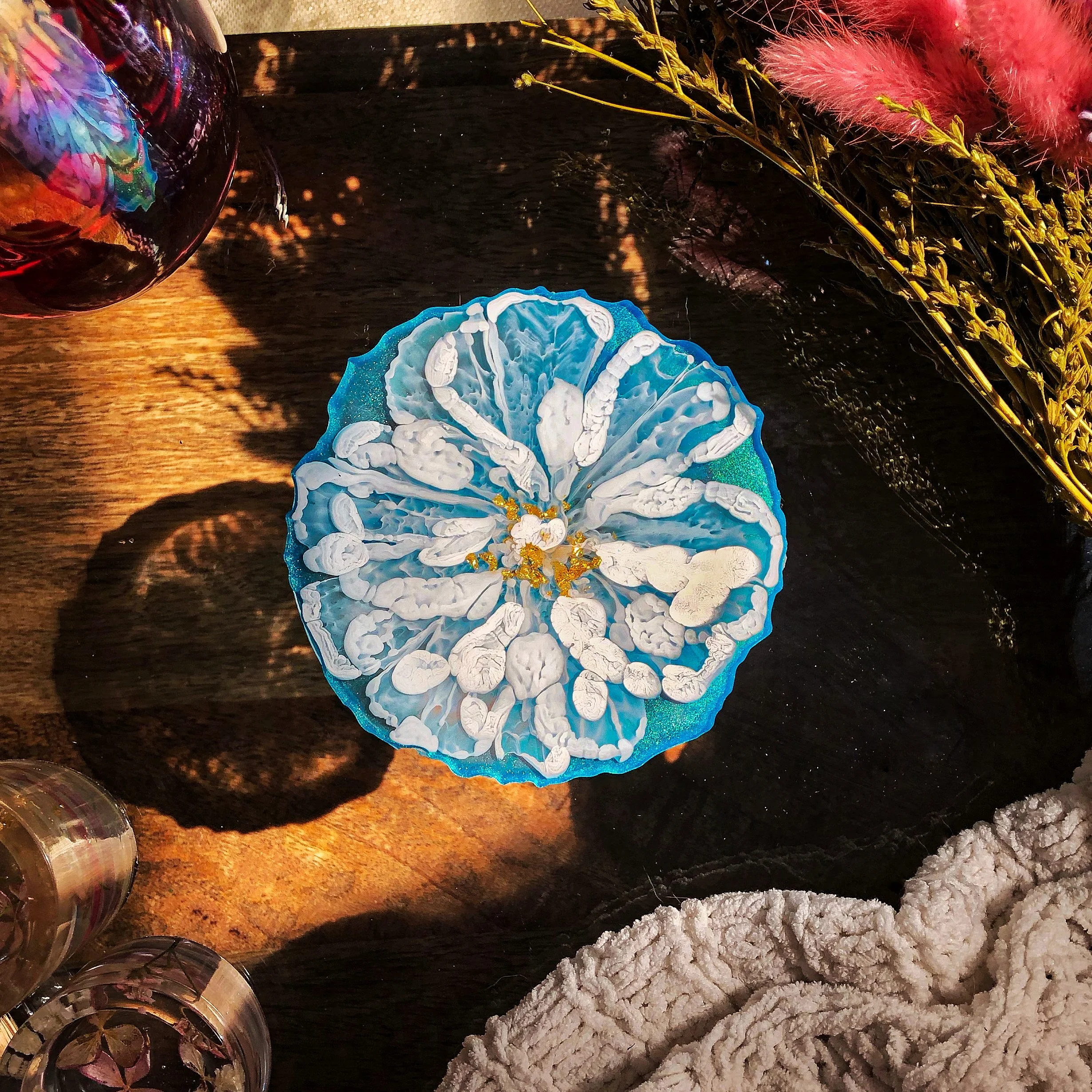 As long as the object being submerged has no moisture, anything can be preserved in resin! Or, you can have something made of purely resin that looks like a painting. This process uses only resin and different colorants to provide form and composition. A variety of things can be made that are not only decorational, but functional like coasters, ring holders, kitchen-ware, jewelry, and more.