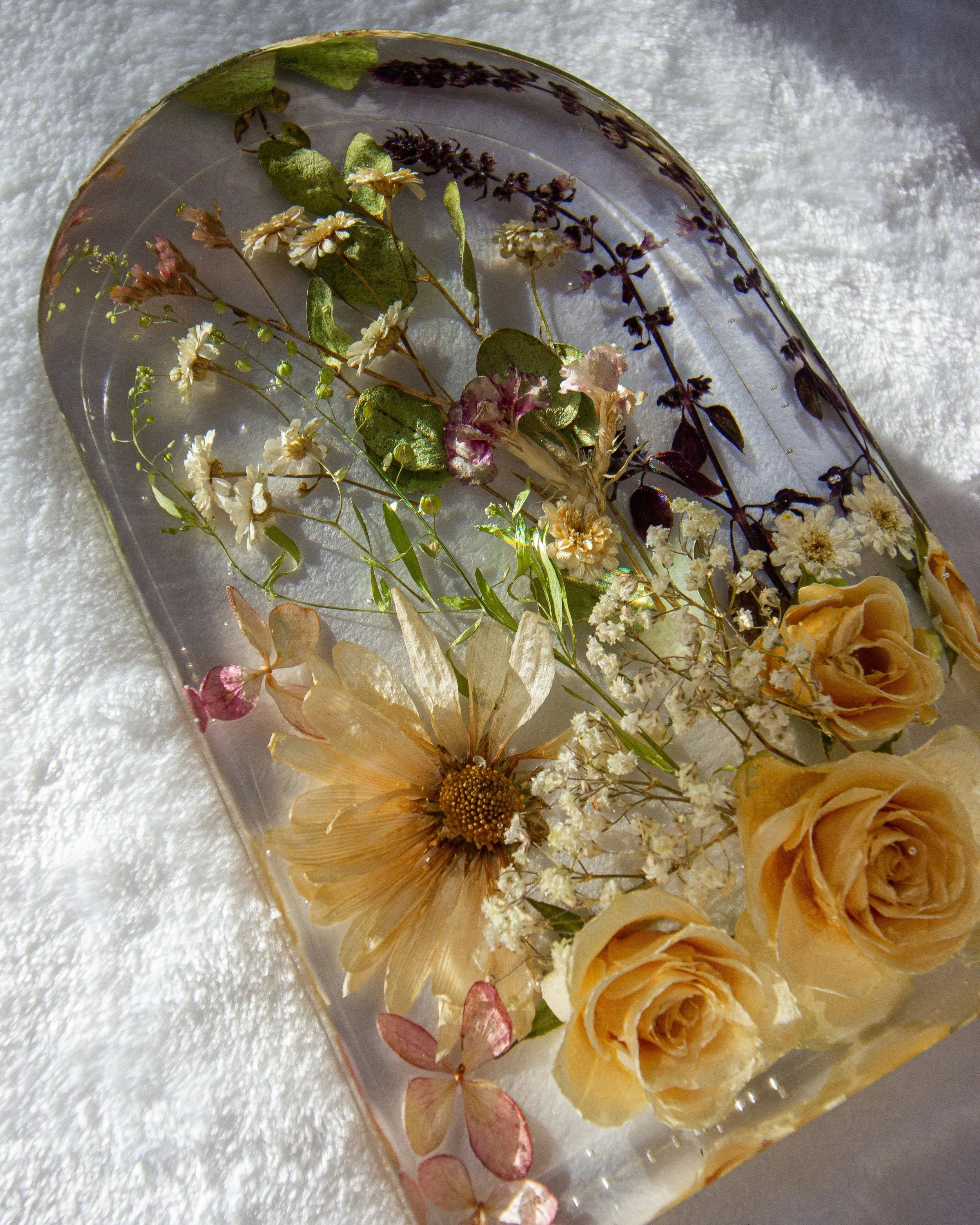 Exclusively for pressed florals, the cheeseboards and tea stands are a show-stopping addition to your kitchen that can make use of leftover preserved flowers from a larger resin piece, or can be requested as standalone. They are great conversation starters when hosting friends and family, and serve as meaningful and functional additions to your kitchen.