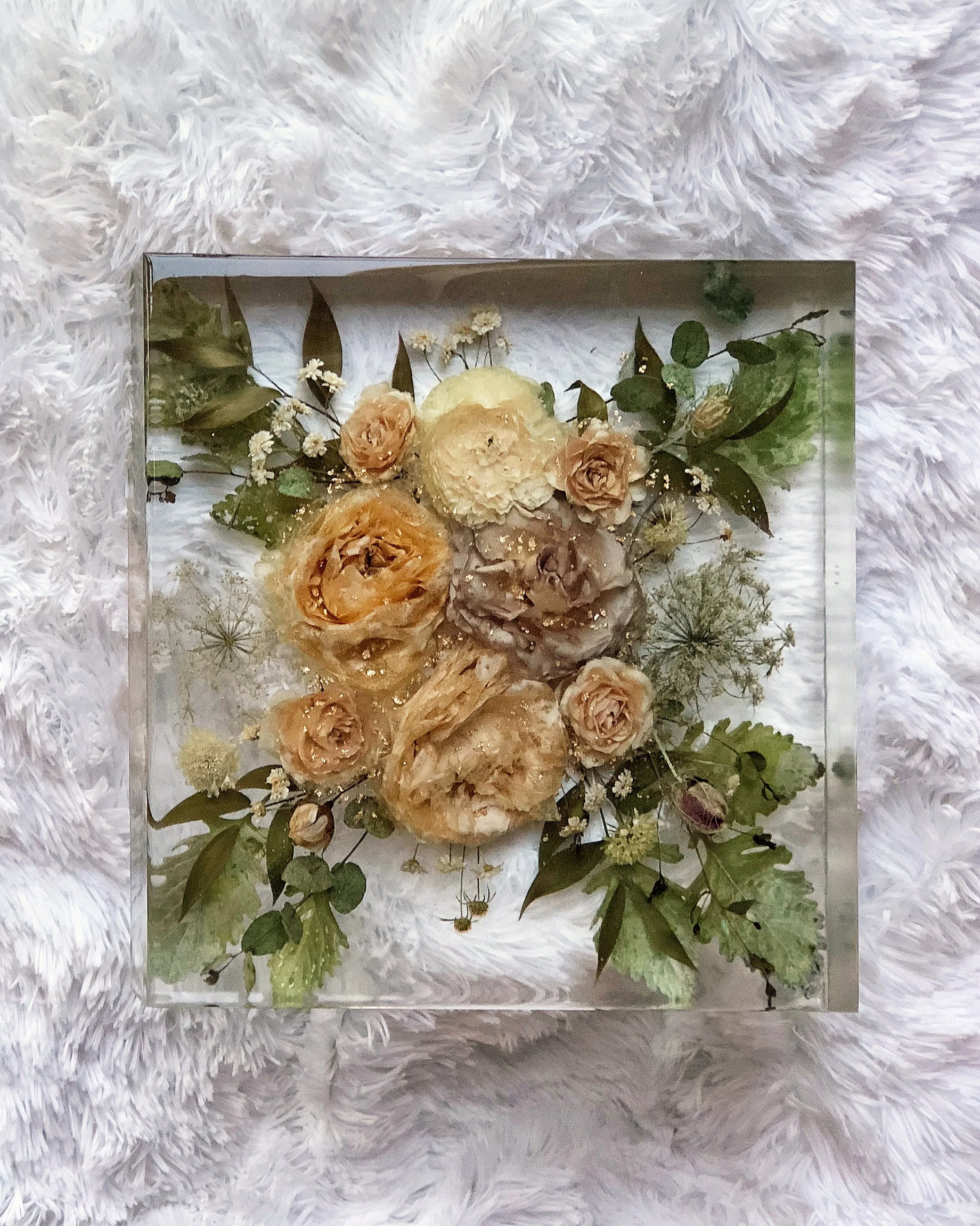 Traditional floral blocks range in square and rectangle sizes as listed below, and can fit larger bouquets and arrangements. Please note that these are starting prices that can vary when considering custom design versus artist’s choice design, width of the piece, and amount of flowers that need preservation. Shipping not included.